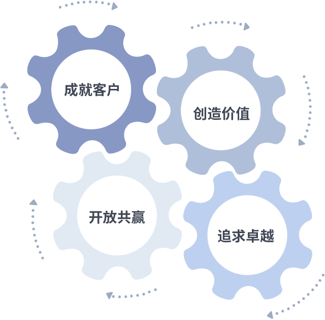成就客户是一切决策的出发点,,,,创造价值是衡量所有工作的标准,,,追求卓越是我们做事做人的态度,,,开放共赢是我们的格局也是最终的结果。。。。价值观的齿轮环环相扣,,,,推动着组织里的每个人不断向前。。